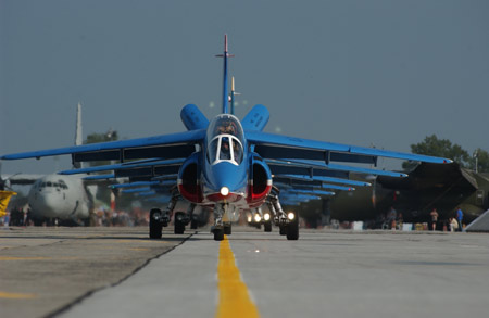 法国空军的“法兰西巡逻兵”飞行表演队正式成立于1964年2月。飞行表演队的飞机涂着同法国国旗一样的红、白、蓝三种颜色,机群在空中做飞行表演时也常常把着三种颜色的烟迹留在空中。它象征着“自由”(红色)、“民主”(白色)、“博爱”(蓝色),体现了法国人民勇敢、浪漫的传统和对未来美好的愿望。图为跑道上排列整齐的飞行队表演机(来源:舰船知识网络版)
