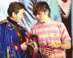 庆功会以京剧《大闹天宫》开场,各路天王把周杰伦簇拥在中央,隐喻“唯周杰伦独尊”。随后,川剧大师彭登怀的弟子上台伴着《我的地盘》表演了变脸。站在台侧的周杰伦目不转睛地盯着表演者,然后走到表演者身边左看右看,最后干脆动手搜起身来。听到观众的笑声,周杰伦很不好意思地说:“等回家再把老师扒光了查。”