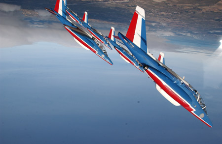 法国空军的“法兰西巡逻兵”飞行表演队正式成立于1964年2月。飞行表演队的飞机涂着同法国国旗一样的红、白、蓝三种颜色,机群在空中做飞行表演时也常常把着三种颜色的烟迹留在空中。它象征着“自由”(红色)、“民主”(白色)、“博爱”(蓝色),体现了法国人民勇敢、浪漫的传统和对未来美好的愿望。图为飞行员们在高空中做倒飞动作(来源:舰船知识网络版)