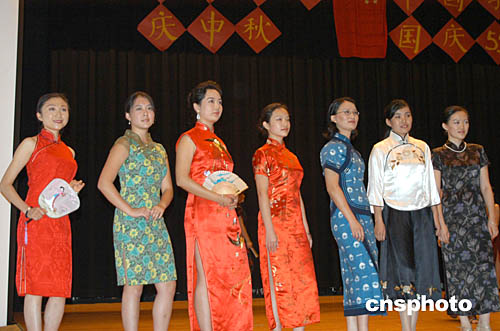 华盛顿的中国留美学生当地时间九月十二日晚举行联欢会庆祝国庆55周年,欢度中秋佳节。这是女留学生表演的具有中国民族特色的旗袍秀。作者:余东晖