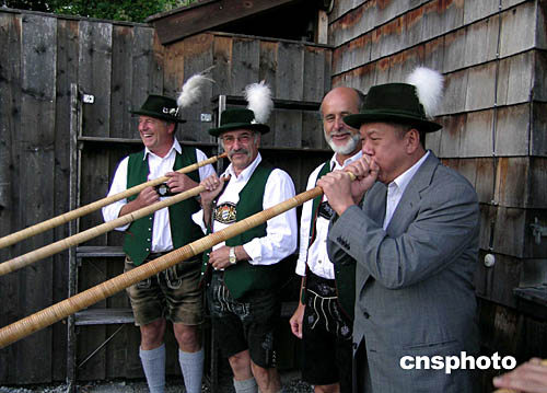 十三日傍晚﹐澳门特首何厚铧结束了对德国巴伐利亚州一天的参观访问后来到阿尔卑斯山脚下游览﹐当地艺人吹起传统的阿尔卑斯号角欢迎客人。对长长的号角﹐众人皆不得其法﹐只有何厚铧信手拈来即能吹响。作者:孙兆震