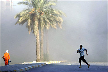 中新网9月14日电 据法新社报道,9月13日,在伊拉克首都巴格达,一名男子逃离市中心海法大街上发生的激烈冲突,另一名伊拉克清洁工则在大街上平静地走着。巴格达市中心地带一度被视作萨达姆支持者的根据地,尽管这里高楼林立,但驻伊美军经常会和支持萨达姆的游击队发生冲突,而这次的交火相当激烈。(固山)