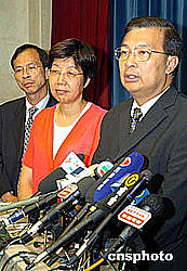 图为会后谭耀宗向新闻界作简报。