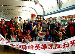 西藏自治区体育局、中国科学探险协会主办的“珠穆朗玛峰环保大行动”圆满结束,十六日二十余名志愿者、新闻记者顺利返回北京时,兴高采烈地在首都机场合营留念,祝贺活动圆满结束。中新社记者:宋吉河