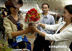 安利(中国)日用品公司员工,十六日晚在首都机场向“珠穆朗玛峰环保大行动”顺利返京的志愿者献花祝贺,以表示对她们的敬佩。