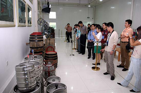 在博物馆百年历史和文化展示区里,顺着时空的脉络,采访团成员通过详尽的图文资料,了解了啤酒的神秘起源、青啤的悠久历史、青啤数不胜数的荣誉、青岛国际啤酒节、国内外重要人物来青啤参观访问的情况。