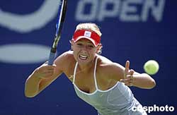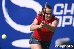 九月二十二日,中国网球公开赛的WTA赛事的女单比赛继续进行,在北京网球中心中央球场进行的一场引人注目的女单比赛中,三号种子俄罗斯选手莎拉波娃轻松战胜另一名俄罗斯选手的帕诺娃,顺利晋级下一轮比赛。中新社记者:盛佳鹏