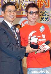 歌星许志安9月23日在香港出席由职业安全健康局、劳工处及香港电台联合举办「精灵一点---职业卫生约章签署仪式」记者会,助理广播处长邵卢善向「职安健大使」许志安颁赠纪记品。作者:邓庆乐