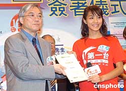 歌星官恩娜9月23日在香港出席由职业安全健康局、劳工处及香港电台联合举办「精灵一点---职业卫生约章签署仪式」记者会,官恩娜获委任为「职安新星」。作者:邓庆乐