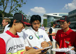 参加F1中国大奖赛和其他辅助赛的车手,九月二十四日在上海国际赛车场开始练习。图为华裔车手董荷斌为车迷签名。作者:潘索菲