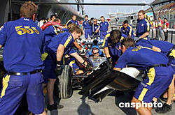 九月二十六日F1中国大奖赛将在上海国际赛车场举行。连日来,参赛车队积极做好各项充分准备。图为英美车队加紧练习如何快速维修赛车。作者:潘索菲