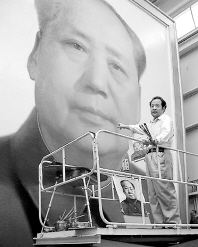 按照惯例,每年国庆节前,天安门城楼的毛泽东主席画像都要更换,今年也不例外。自1977年就一直担负画主席像工作的画家葛小光已在画室半个多月,目前这幅长6米、宽5米的油画已近尾声。葛小光说,由于主席像挂在户外,经受风吹日晒,所以这幅油画的颜色和造型需要技巧,尽量减少季节、光照等因素的影响,挂上去后无论从哪个角度看都不会有太大变化。如果天气没有变化,27日晚将挂上城楼。