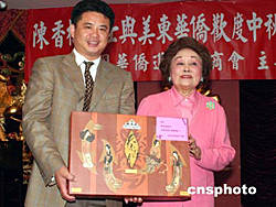 美东时间二十四日中午,著名美籍华人陈香梅从华盛顿赶到纽约,与美东华侨一起欢度中秋佳节。美国华商会会长邓龙在联谊会上向陈香梅(右)赠送精制的月饼。作者:龚文谟