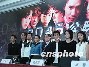 中新网北京9月25日电(记者应妮)作为《二0四六》在内地宣传的最后也是最重要的一站,北京的媒体见面会今天终于在千呼万唤中登场。导演王家卫、演员梁朝伟、王菲、刘嘉玲、张震、董洁一行出现在媒体面前,章子怡和巩俐依然缺席。