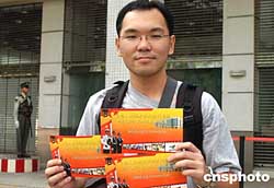 第一位领取参观票的欧阳先生二十五日晚八时许就开始排队,他准备和父母一起去参观。作者:梁永强