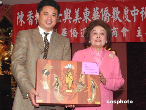 美东时间二十四日中午,著名美籍华人陈香梅从华盛顿赶到纽约,与美东华侨一起欢度中秋佳节。美国华商会会长邓龙在联谊会上向陈香梅(右)赠送精制的月饼。 龚文谟 摄