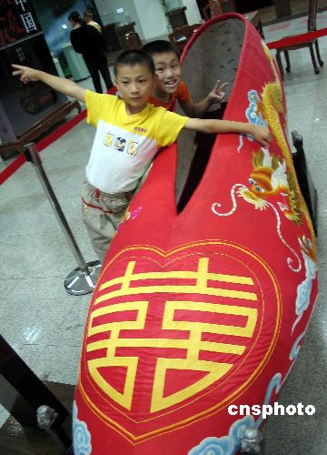 江苏镇江市的两名儿童与一只世界最大的绣花鞋合影。据介绍,这只在当地商业城展出的绣花鞋全长2.8米,宽0.87米,高0.71米,重达63公斤,鞋内可躺卧两至三人,是由温州7名著名手工艺专家用半年多时间精心制作而成,共耗去1公斤多真丝彩线,五匹布,及100多公斤有关材料。鞋面绣有大大的双喜字、两侧绣有龙凤图案,绣面光亮,纹理分明,色彩鲜艳。作者:陈岗