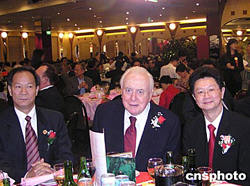 澳大利亚新南威尔士州华人华侨当地时间9月26日举行盛大联欢晚会,热烈庆祝中华人民共和国成立五十五周年和中国的传统节日中秋节。中国驻澳大使的代表曹东昌(右)、中国新任驻悉尼总领事邱绍芳(左)、澳大利亚前总理惠特拉姆(中)以及新州各界人士600多人欢聚一堂。作者:刘雨生
