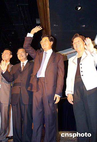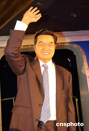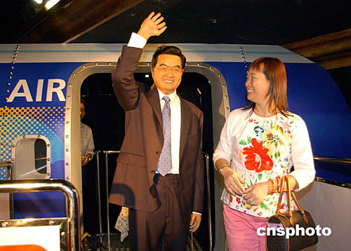 图为参观者站在正挥手致意的胡锦涛主席身边。