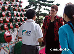 南通别具特色的民间艺术,引起正在该市参加首届世界大城市带高层论坛嘉宾们的兴趣。图为新西兰前总理希普利在饶有兴趣地观赏南通的哨口风筝表演.作者:王晓红