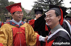 中国科学院研究生院二零零四年博士、硕士学位授予仪式九月二十八日在北京举行,共有三千七百五十五名毕业研究生获得学位。图为中科院副院长、中科院研究生院院长白春礼院士在勉励莘莘学子。据悉,截至二零零三年,该院已培养二万余名博士研究生和四万余名硕士研究生。作者:徐曦弋
