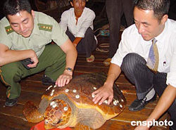 这只雌性绿海龟体长1.1米,宽0.8米,重达83公斤,背面及腹面角板均有色泽的斑纹,表面呈橄榄色,并有多种贝壳化石附着点缀其间,煞是好看。据水产部门介绍,该海龟系国家二级重点保护水生野生动物,主要分布于中国台湾、福建和海南等沿海一带海域。作者:陈如冰
