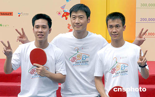 歌星黎明(中)与奥运乒乓球男子双打银牌得主高礼泽(左)、李静9月28日在香港出席「公益金便服日」突破纪录仪式,大会并举行乒乓球友赛,赛后黎明与香港「乒乓孖宝」合照。