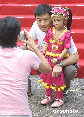 歌星黎明9月28日在香港出席「公益金便服日」突破纪录仪式,与为活动担任表演的小朋友合照。