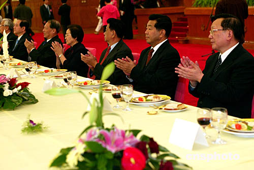 全国政协、中央统战部九月二十八日在北京举行招待会庆祝中华人民共和国成立五十五周年,全国政协主席贾庆林、国务委员唐家璇等出席招待会。中新社记者:满会乔