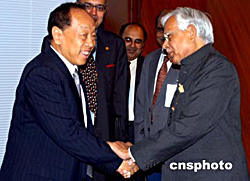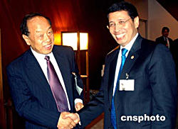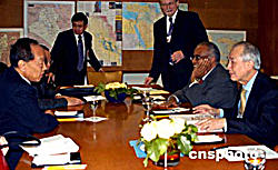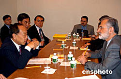 当地时间九月二十八日,正在纽约联合国总部出席第五十九届联大的中国外长李肇星(左),会见了联合国名人小组成员。由联合国秘书长安南提议建立的“威胁、挑战与变革”高级别名人小组,专门负责研究联合国的改革问题,并将于年底提出报告,供会员国审议。作者:赵海燕