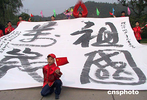 在中华人民共和国成立五十五周年到来之际,一位名叫陈鼎新的上海十岁学童(前),九月二十九日在北京八达岭长城把自己书写的一幅巨笔书法作品捐献给“中国少年儿童基金会”,以表达对祖国的祝福。作者:宗金柱