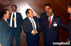 当地时间九月二十八日,正在纽约联合国总部出席第五十九届联大的中国外长李肇星,会见了巴布亚新几内亚外长纳马柳(右一)。作者:赵海燕