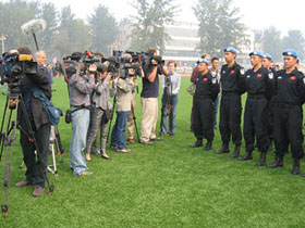 中新网9月29日电 据外交部官方网站消息,2004年9月29日,外交部外国记者新闻中心组织外国驻京记者赴河北廊坊,采访拍摄了中国维和民事警察培训中心和即将赴海地执行维和任务的中国维和防暴警察分队。来自23个国家28家机构的58名外国驻京记者参加了采访。此次采访活动由新闻司副司长刘建超带队。