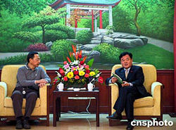 湖南省副省长贺同新(右)九月三十日在长沙会见全国政协委员、香港兴业集团董事会副主席查懋声一行。查懋声来湘是为了考察湖南株洲市一个总投资额近七亿元的房地产项目。作者:邓霞