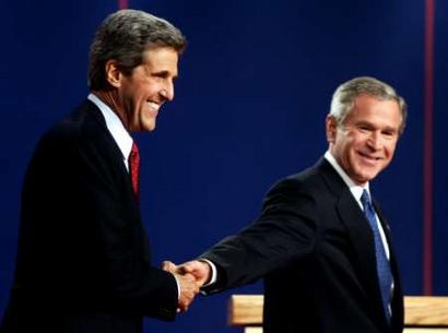 两位候选人,一位是总统,一位是参议员,皆出自富家名校,又都伶牙俐齿,在辩论场上也已身经百战,不过,布什作为在任总统,又在民意调查中小占上风,加上在伊拉克战争上、尤其在反恐工作中得到许多选民认可,他似乎只要在辩论中保持不败即可站稳脚跟。