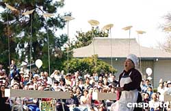 美西时间十月二日,北加州华人联盟在加州联合城举办一年一度的硅谷欢庆中秋佳节及迎中国国庆游园会。图为杂技名家夏克敏先生在题为“中国心·硅谷情”的游园会表演杂技。作者:陈钢