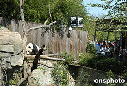 10月3日秋高气爽,生活在华盛顿国家动物园的中国大熊猫“添添”和“美香”兴致勃勃,玩耍嬉戏,吸引众多游客。作者:余东晖