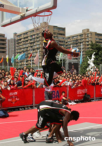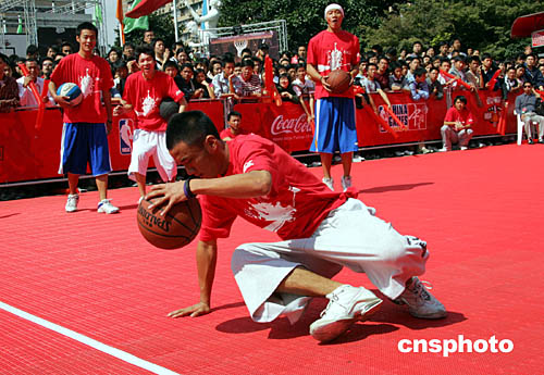 一批来自法国的灌篮高手在上海“二零零四可口可乐NBA嘉年华”开幕式上表演,吸引上海篮球迷观赏。