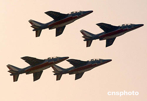 “法兰西巡逻兵”特技飞行表演队“阿尔法”飞机,十月六日下午在北京南苑机场进行飞行预演,精彩的飞行表演,博得北京观众喝彩。由于天气能见度极低,许多高难度飞行科目未能如期进行。中新社记者:邹宪