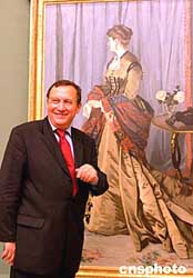 | “法国印象派绘画珍品展”中外记者招待会十月八日在中国美术馆举行。法国奥赛博物馆馆长勒穆瓦纳先生向媒体介绍克劳德·莫奈的作品《戈迪拜尔夫人》。“法国印象派绘画珍品展”将于十月十一日至十一月二十七日在中国美术馆举行。本次展览展出法国精选出的51幅具有代表性的印象派作品,它们均出自法国印象派绘画史上最重要的十四位画家之手,这也将是中国举行的水平最高、最为重要的一次西方绘画作品展。作为“法国文化年”项目的重头戏,法国国家收藏品中的印象派珍品将于二零零四年十月起,连续六个月在在中国北京、上海、香港展出。作者:张勤