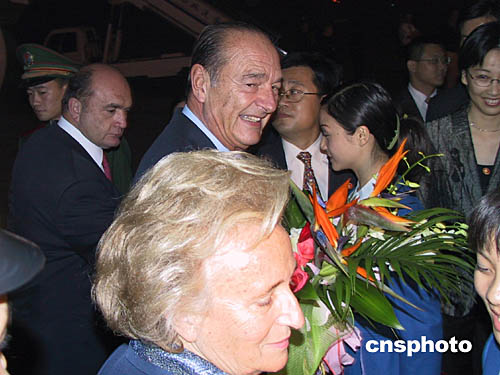 晚上10时05分,希拉克刚刚走出机舱,成都双流国际机场上空立即绽开了无数鲜艳的礼花。站在机舱门口的希拉克,微笑着向前来迎接他的数百名中法人员挥手致意。