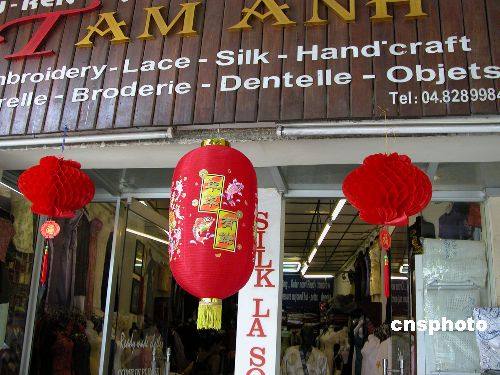 越南文化与汉文化有千年情结。越语中汉文化的影响首先是越南的姓氏,越南人大都有一个汉语化的姓再加上一个名。此外,越南人至今保持着过端午节、春节的习俗。图为河内街头的一家服装店门口挂着大红的灯笼,灯笼上写着“年年有余”的汉字。吴庆才 摄