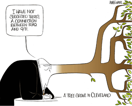 中新网10月10日电 10月5日,在美国俄亥俄州的克利夫兰市,现任副总统切尼与民主党人爱德华兹进行了一场激烈辩论。在唇枪舌剑的过程中,切尼公然声称,他从未说过伊拉克与911事件有关——事实上,认为伊拉克与911事件存在联系是切尼这几年一直挂在嘴边的说辞。童话中曾说,撒谎的人会长出大鼻子。(来源:法国际报刊)