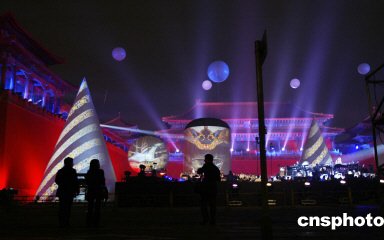 晚会的舞台布置十分简约,九个圆柱、圆锥和圆球状充气囊伫立其间,十分具有未来感,而这种感觉与午门古老浑厚的历史感形成巨大反差,具有强烈冲击力。在演出中,这几个巨大的充气囊又充当了投影幕的作用,夕阳晚霞下的赛纳河水、缤纷雪花中的凯旋门、仿如抽象派的涂鸦、旋转木马……空灵大气的音乐中,五彩绚烂的光柱里,全场一万三千名观众已然陶醉。