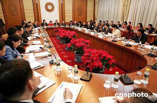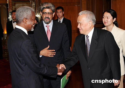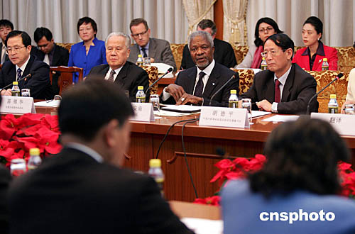 联合国秘书长安南十月十一日在北京钓鱼台国宾馆与中国企业家联合会会长陈锦华(左二)、中国光彩事业促进会副会长胡德平(右一)等中国企业家代表座谈,共同探讨“企业承担的社会责任”等问题。