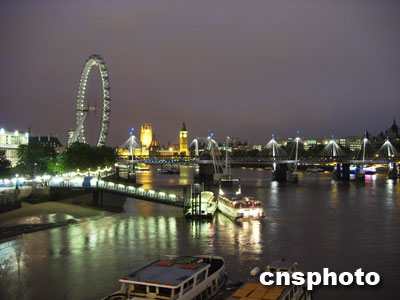 伦敦泰晤士河夜景。图左环形物为大型观光摩天轮“伦敦眼”,前方拉索桥为纪念英女王伊莉莎白二世就位半世纪的“黄金五十周年”大桥,远处矗立的尖顶建筑为大本钟。余瑞冬 摄