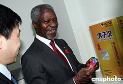 正在北京访问的联合国秘书长安南十月十二日参观艾滋病自愿咨询监测点时,亲自试用即将安装在宾馆、酒店等公共场所的安全套售贩机。中新社记者:毛建军