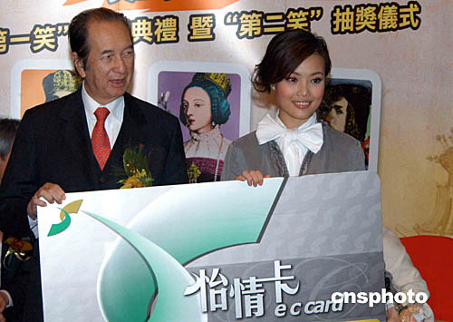 十月十二日,澳门博彩股份有限公司举行蒙罗莉萨“笑三笑”百万元抽奖活动第二次抽奖仪式,香港歌影视红星容祖儿应邀担任抽奖嘉宾,活动中澳博行政总裁何鸿燊向容祖儿赠送怡情卡。作者:梁永强