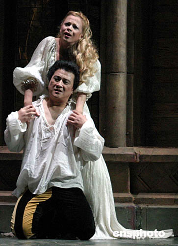 图为中国男高音张建一和法国籍女高音茵娃·慕拉在十月十二日的彩排中。