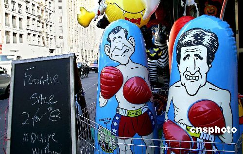 10月12日,印有布什、克里形象的拳击气囊在美国纽约街头出售,顾客可以买来发泄“私愤”。Ic/cnsphoto 摄